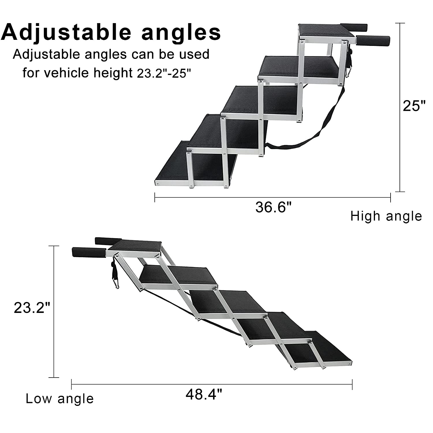 Help your dog access higher places with ease using the Petshug Folding Dog Ramp. Supporting up to 150 lbs, this ramp is made of heavy-duty aluminum and stable 1680D oxford fabric, preventing steps from sagging. Weighing only 11.11 lbs, it is lightweight and easy to carry. The adjustable design allows for a height range of 23.2" to 25" and a length range of 36.6" to 48.4". Perfect for injured or sensitive-joint dogs, this ramp provides a safe and convenient way for your pet to climb into trucks, SUVs, or any hard-to-reach areas.