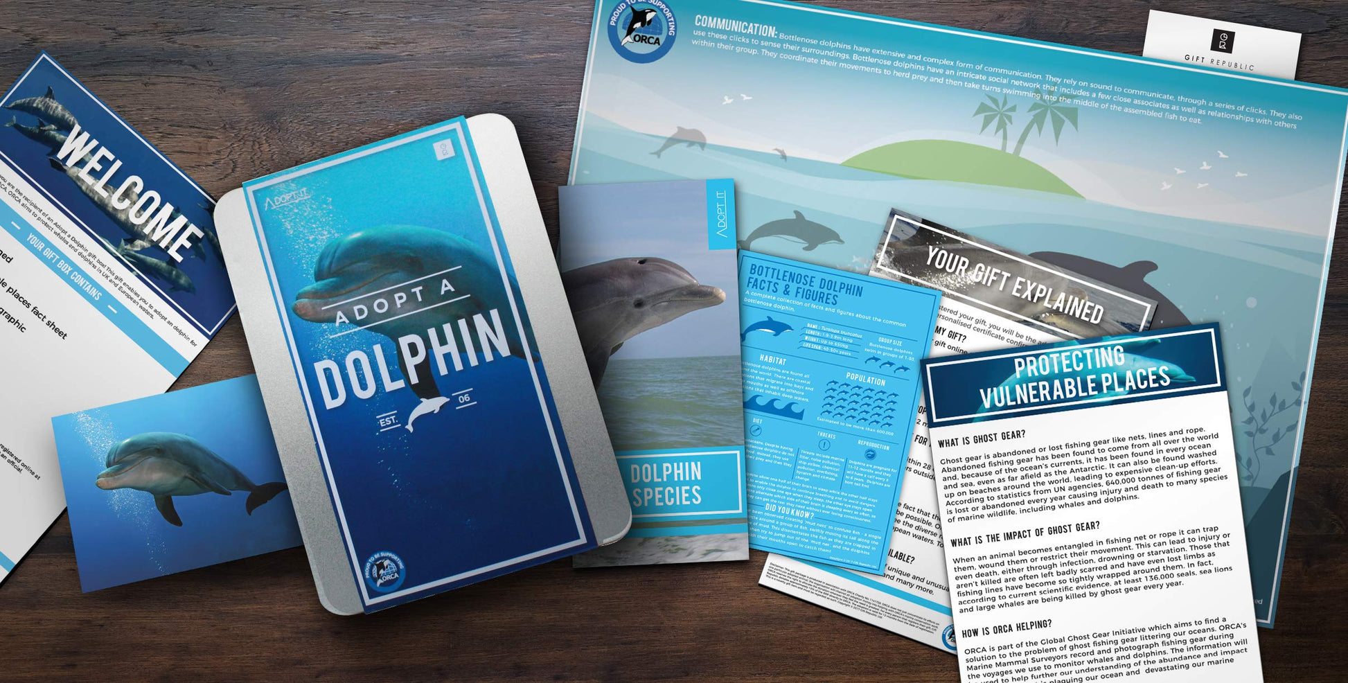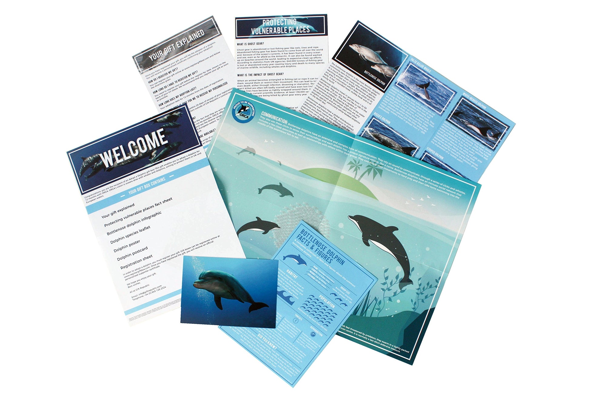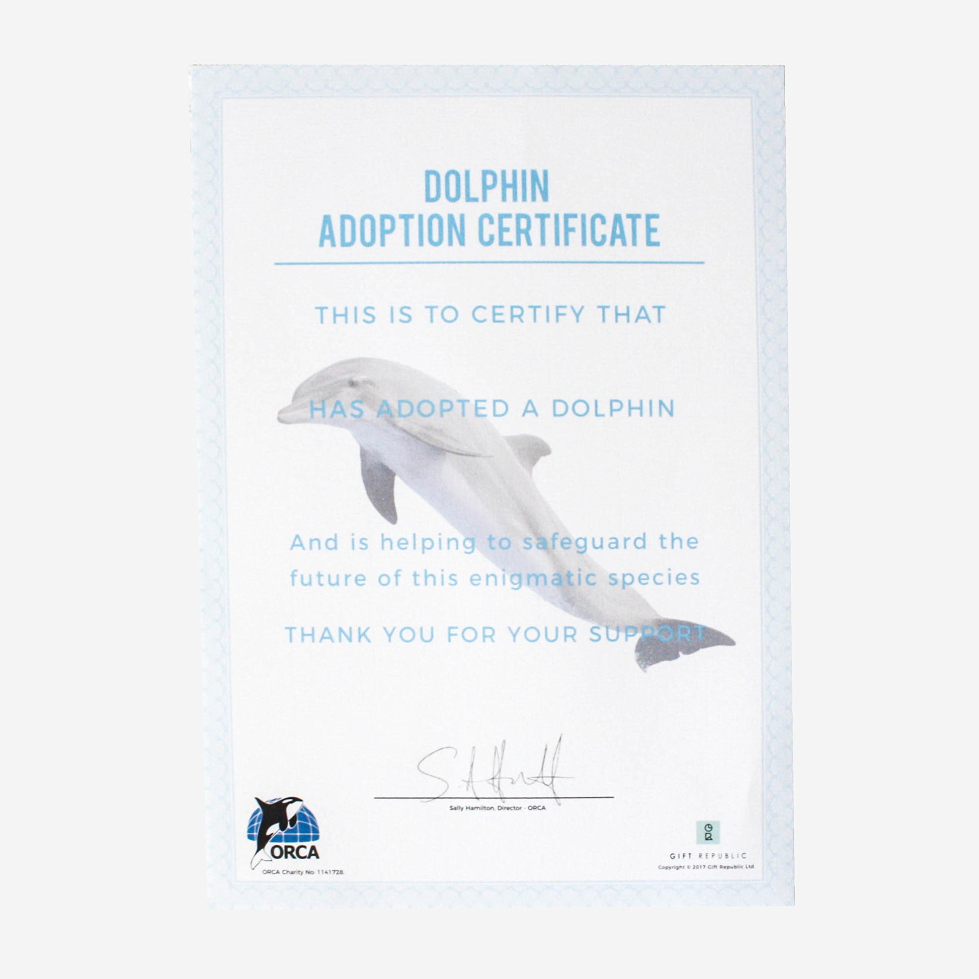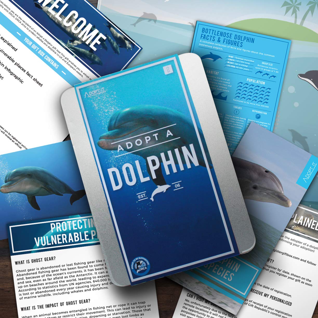Support dolphin conservation with the Gift Republic Adopt a Dolphin pack. This 12-month adoption helps conserve dolphins and their natural habitat through ORCA, a registered charity that tracks and researches dolphins and the effects of abandoned fishing equipment. The adoption pack includes information about the dolphins you are helping and is a perfect gift for animal lovers.