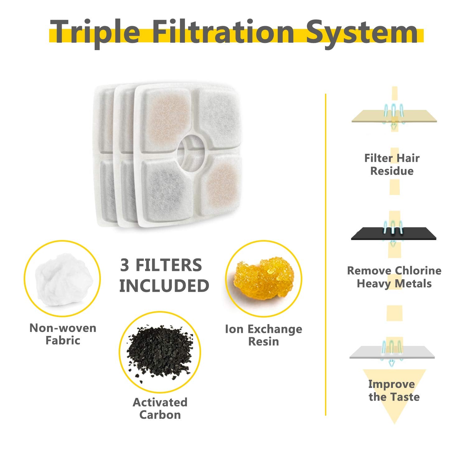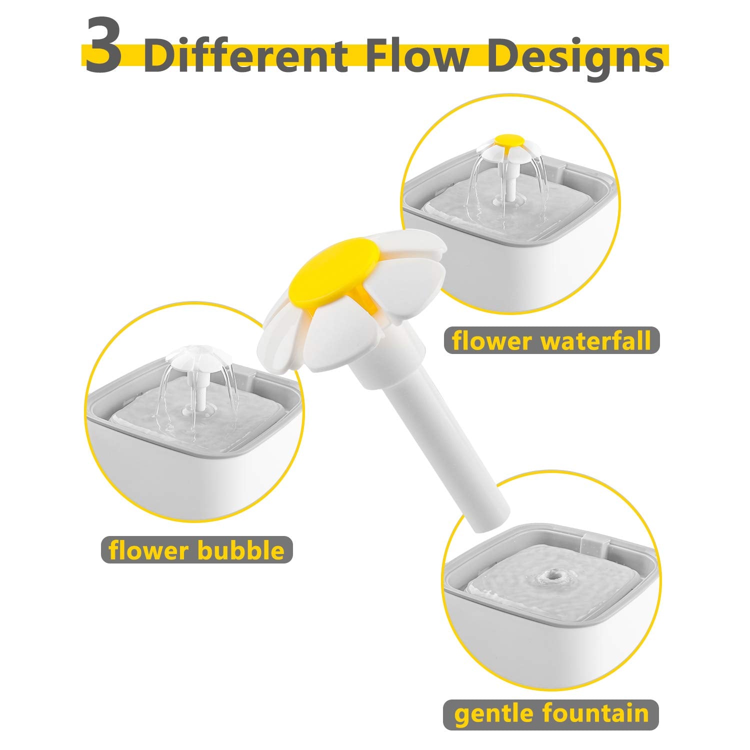 Ensure your pets stay hydrated with the Veken Pet Water Fountain. With a 2.5L capacity, this fountain is ideal for small to medium-sized pets and provides healthy, hygienic water all day. The ultra-quiet pump operates below 40dB and lasts between 1.5 to 2 years. Made from BPA-free PP resin, the fountain is durable and easy to clean. It offers three water flow designs (flower waterfall, flower bubble, and gentle fountain) to suit your pet's preferences. Equipped with a triple filtration system, the fountain includes three replacement filters to keep the water clean and fresh. Package dimensions are 7.8 x 7.6 x 6.1 inches.