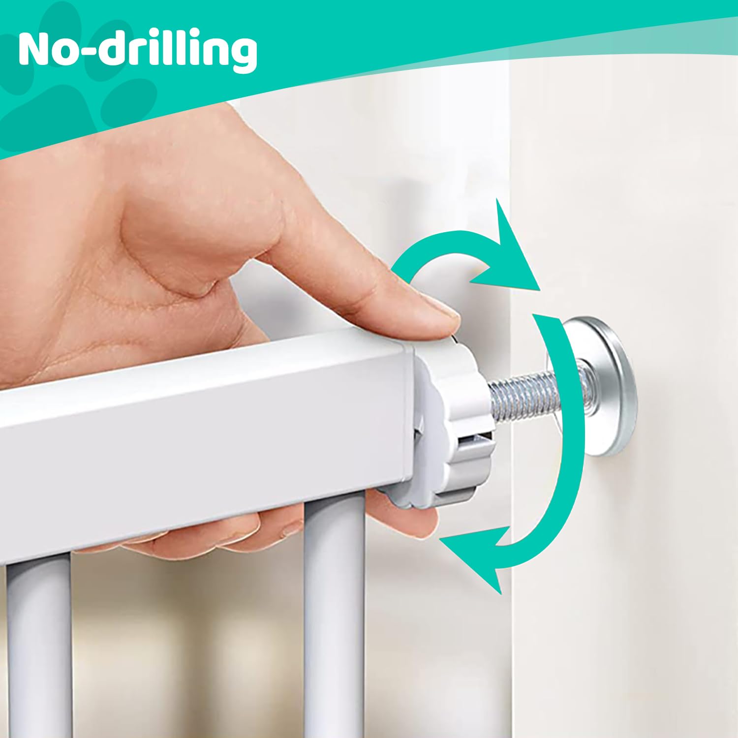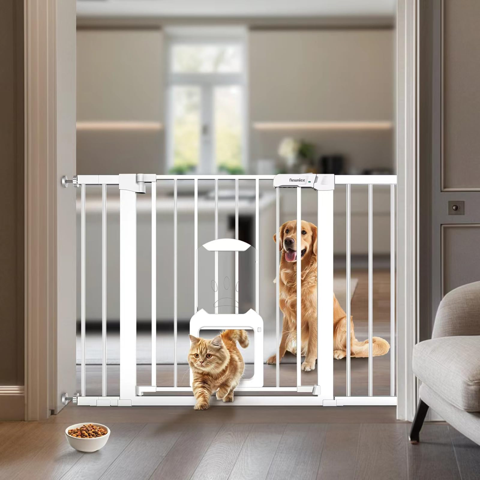 Ensure the safety of your children and pets with the Newnice Baby Gate with Cat Door. Constructed from sturdy metal, this gate promises superior strength and longevity. Standing 30 inches tall and adjustable in width from 29.7 to 46 inches, it offers ample space and fits various doorways. The large walk-through design is perfect for parents carrying babies. The auto-close feature and double-lock safety release ensure toddlers can't easily open the gate, while its robust design withstands impacts up to 150 pounds. Installation is a breeze with the pressure mounting system, making it suitable for stairs, hallways, and open spaces.