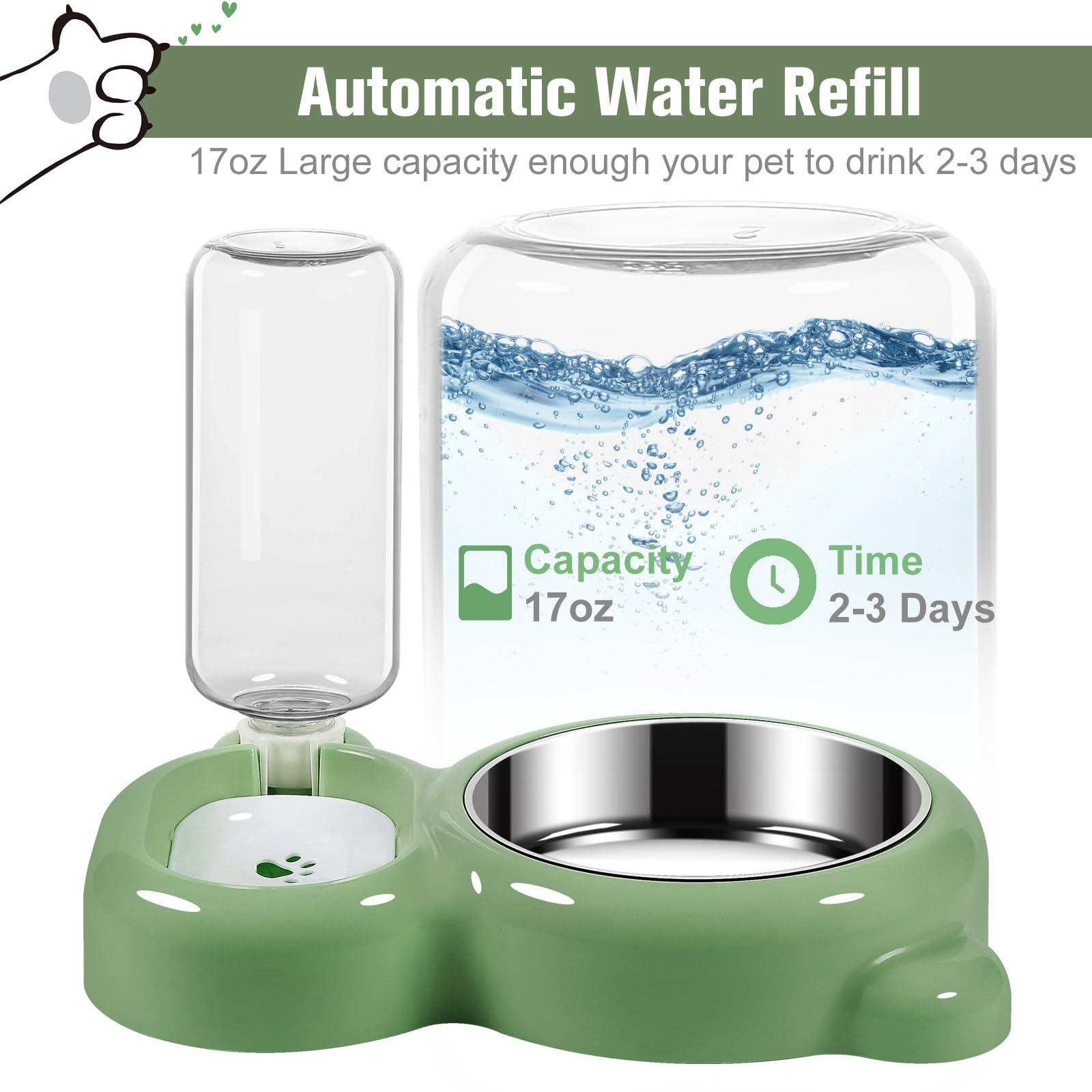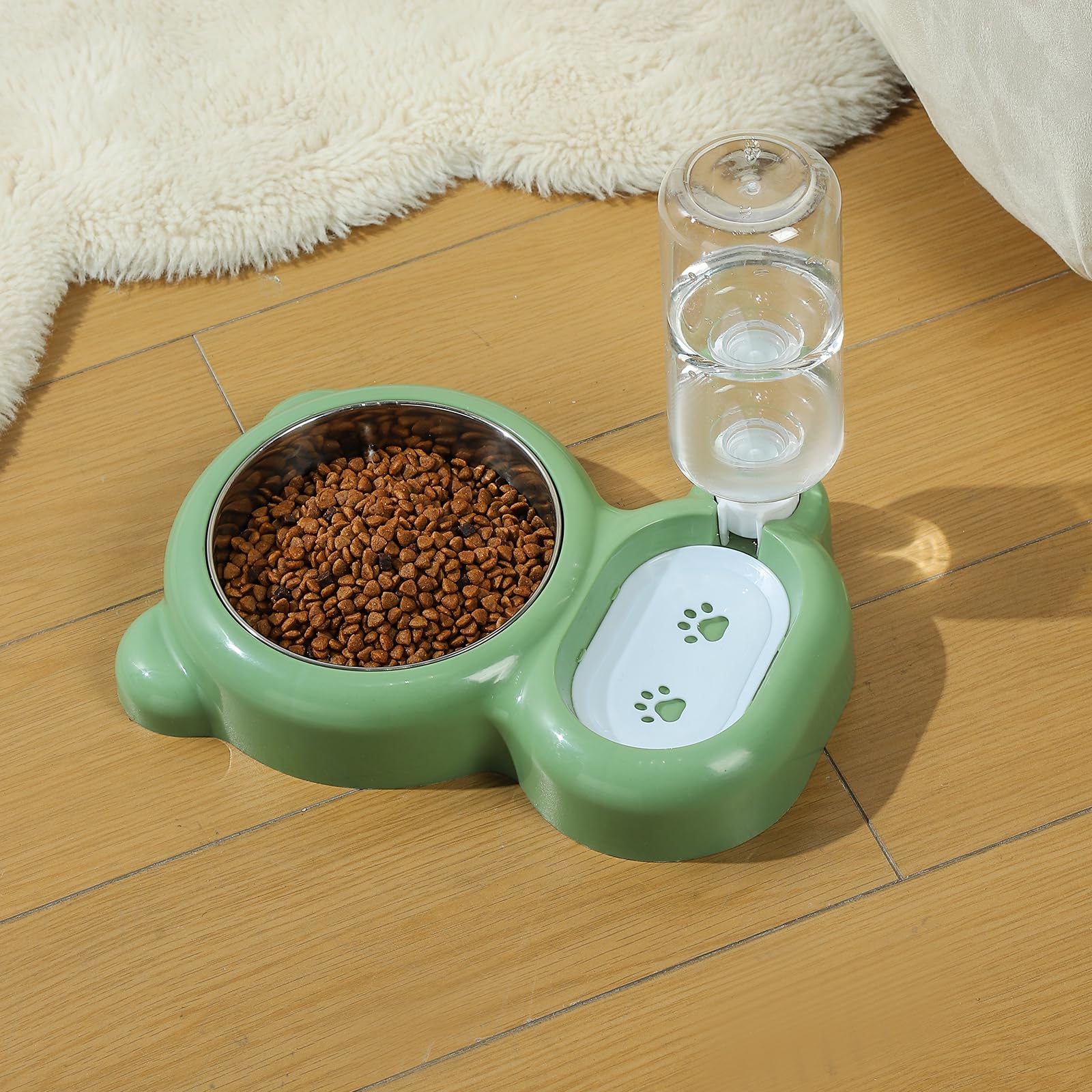 Ensure your pet stays hydrated with the Azwraith Automatic Water Supply Cat Bowl. This green bowl features a siphon mechanism for automatic water supply and a stable water level. The 17 oz large-capacity water bottle ensures fresh water availability daily. Made from eco-friendly, food-grade PC material, it's safe and easy to clean. The 2-in-1 design includes a detachable stainless-steel food bowl and a water bowl with a divider to prevent wet fur and maintain water cleanliness. The non-slip base prevents spills and messes, making it ideal for any pet.