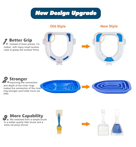 The FIFIPETS Cat Toilet Training Kit in blue and white helps train your cat to use a human toilet in 7 weeks or less, eliminating the need for litter boxes. The kit includes a standard white seat that fits most toilet seats and is ideal for older cats, large cats, kittens over 3 months, and multiple-cat households. Save money on kitty litter and enjoy a cleaner environment with this easy-to-use training kit.