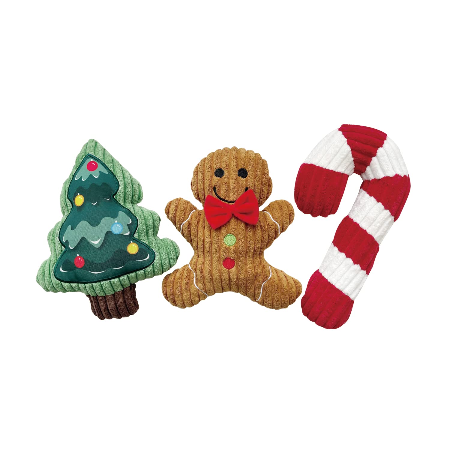 Celebrate the holiday season with PetLike's Christmas Plush Chew Toys. This set of three includes a gingerbread man, Christmas tree, and Christmas cane, providing your furry friend with festive fun. Each toy has a squeaker inside, adding extra excitement to playtime. Made with soft and durable material, these toys are gentle on your pet's teeth and gums. Not only are they a great gift for your own pets, but they also make wonderful presents for your family and friends' pets. Order now to make your pet's holiday season even more special.