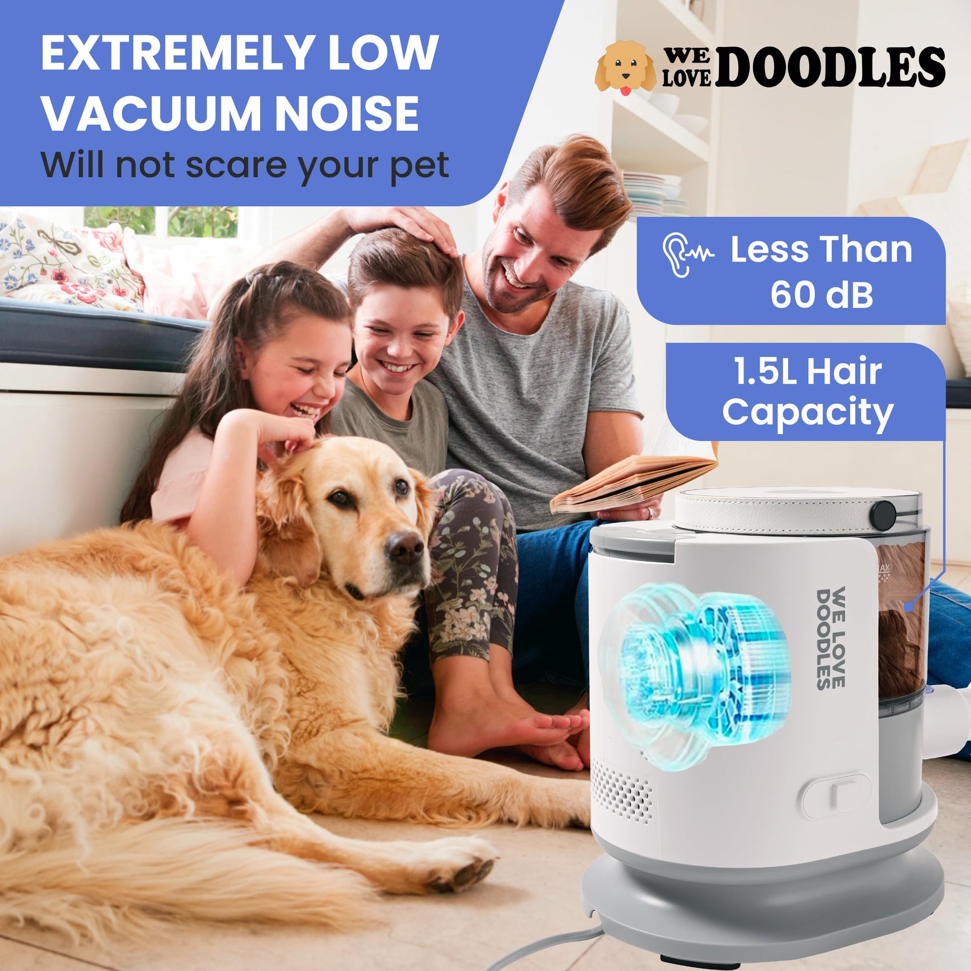 Elevate your pet grooming routine with the We Love Doodles Dog Hair Vacuum & Grooming Kit. This professional-grade kit includes a whisper-quiet vacuum producing less than 60 dB of sound for a stress-free grooming experience. The versatile hub features a 1.5L dust cup and adjustable vacuum modes. It comes with three comb sizes (6mm/9mm/12mm) for customized trimming. The 6-in-1 kit includes tools for brushing, shedding, and collecting stray hair, ensuring a complete pet care solution. The kit is backed by a satisfaction guarantee for peace of mind.