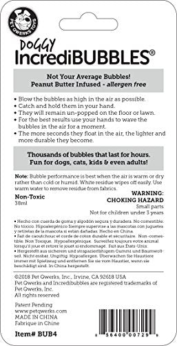 Enjoy hours of fun with your pet with Pet Qwerks IncrediBubbles. These Peanut Butter Flavor-Infused Bubbles are not your average bubbles. Safe and fun for pets and kids, they can be caught, stacked, and rolled on the ground. The bubbles dry in the air and land intact, waiting to be chased and burst by pets. Made with a non-toxic formula, they are slightly thicker than children’s bubbles. Ideal for outdoor use, the bubbles can be messy or sticky and may leave a white non-staining residue after popping, easily wiped away with a hand or damp cloth.
