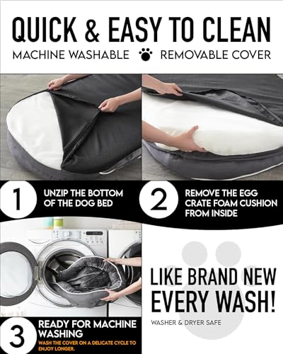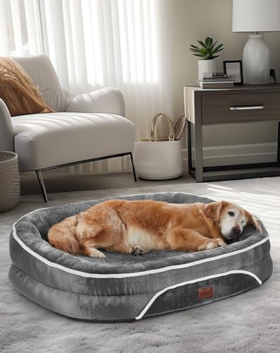 Provide your dog with ultimate comfort and support with the OhGeni Orthopedic Dog Couch Bed. Featuring egg crate foam filling, this bed ensures even weight distribution and joint support. The 3-inch high cushion, removable and machine washable cover, and waterproof inner lining make it durable and easy to maintain. The bed's ultra-soft fleece fabric interior offers added comfort, while the plush side bolsters create a secure and cozy environment for your pet. With overall dimensions of 35 x 26 x 6 inches, this bed is perfect for large dogs, ensuring they have a comfortable place to rest.
