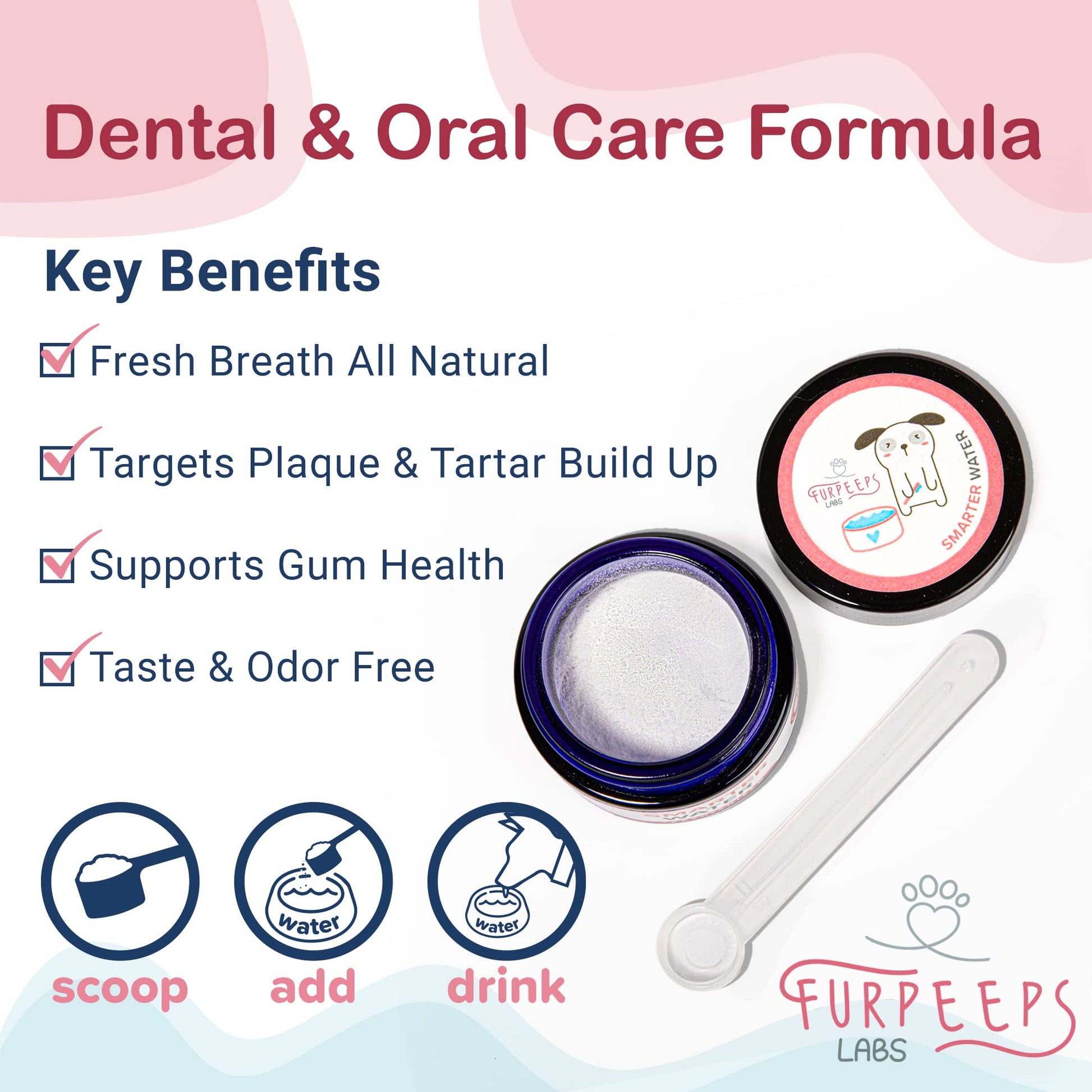 Keep your pet's breath fresh and teeth sparkling with Furpeeps Labs Dental Water Additive. This easy-to-use formula turns your pet's water bowl into a molecular toothbrush, fighting bad breath, gum disease, and tooth decay naturally. Crafted with all-natural, vegan, plant-derived ingredients, it’s free from artificial flavors, colors, fillers, preservatives, or harsh chemicals. Just add a scoop to your pet's water bowl daily for effortless dental care. Trusted by pet parents and veterinarians, this additive ensures your furry friend enjoys fresh breath and healthy teeth, making daily oral hygiene simple and effective.